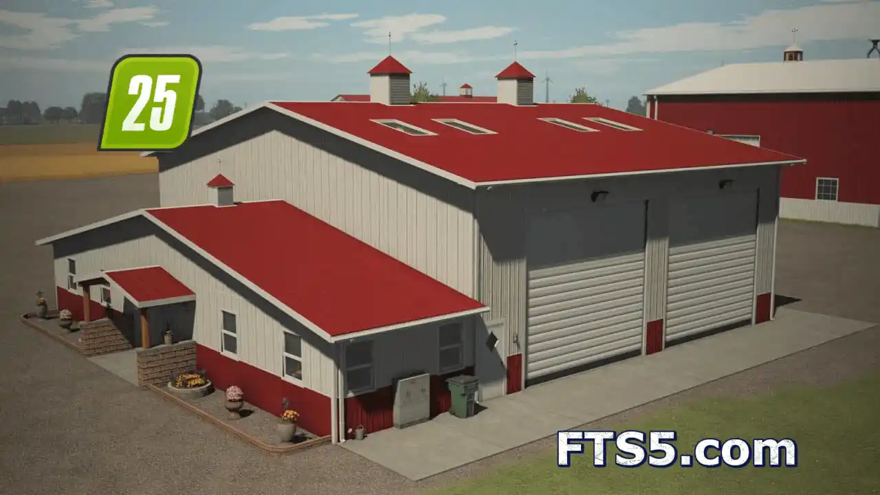 带工作室的美式大厅。建筑设有三扇卷帘门、一扇小型双开门和一扇单开门。您可以在这里存放谷物或车辆。室内外均有照明。色彩配置。